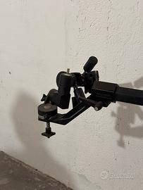 altezza 3,2 metri, con braccio orizzontale a doppio attacco e base mobile pesante a tre appoggi, ideale per studi fotografici, still life e riproduzioni.