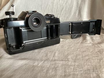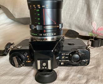 Fotocamera analogica Contax 137 MD Quartz automatica e manuale con memoria del tempo di scatto,tutto funzionante ed in buone condizioni estetiche,segni d’uso veniali,nessun danno.Funziona con quattro comuni stilo AA.Obiettivo Yashica zoom serie ML 35-105/3,5-4,5 macro,rara ed apprezzata lente tuttofare.Con tappo,cinghia ed oculare.