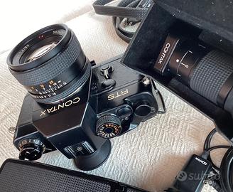 Fotocamera analogica Contax RTS con Zeiss Planar 50/1,4 bella e funzionante,avanzamento,scatto,esposimetro in ordine.Ottima estetica,solo un piccolo colpetto su spigolo.Rivestimento in pelle delicato ma in discrete condizioni,batteria compresa.