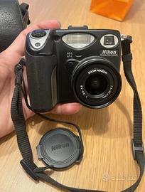 Coolpix 5000 Nikon + carica batteria + 2 batterie+ 2 schede memoria (32 mb nikon/ 128 mb simple tech) + scatola originale + porta macchina fotografica Usta ma tenuta benissimo. Funzionante. Manuale in italiano e altre lingue
