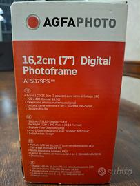 Vendo cornice AGFAPHOTO Digital Photoframe AF5079PS in perfette condizioni, mai utilizzato, completo di confezione originale, istruzioni, telecomando, caricatore con doppio adattatore alla presa.