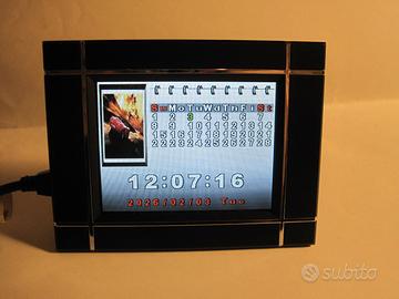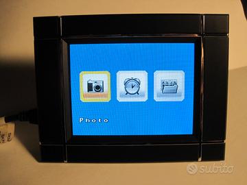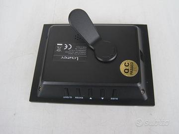 offro una cornice digitale marca Lozer con schermo da 3,3 pollici a colori. Può visualizzare una foto fissa oppure scorrere le foto con intervallo programmabile. Ha la funzione orologio per cui visualizza l’orario e la data. Le foto si copiano nella memoria interna utilizzando una memoria SD/MMC. Dimensioni esterne: Larghezza 11 Cm. Altezza 8,5 Cm. Spessore 2 Cm. Diagonale schermo 8,6 Cm.