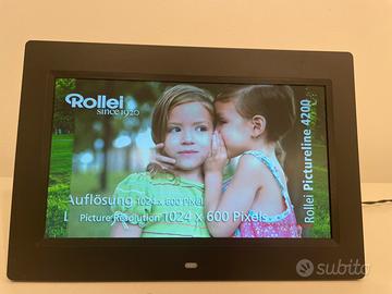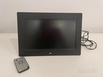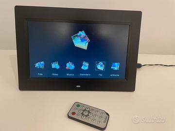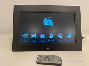 Funzionalità: foto, video, calendario, musica. Si alimenta con penna uss o con SD. Facilissima da impostare. Completa di telecomando ma le funzionalità si possono cambiare anche con i tasti apposti dietro lo schermo.