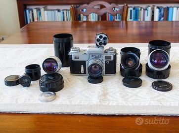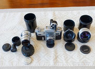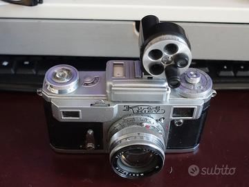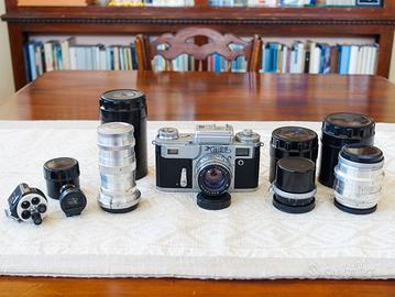 Kiev-4 in ottimo stato, funzionante, ma con esposimetro in parte esaurito + Juppiter-8M (50mm), Juppiter-12 (35mm), Juppiter-9(85mm), Juppiter-11(135mm) + mirino multifocale a torretta + mirino fisso 35mm. IN BLOCCO