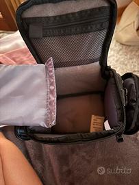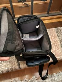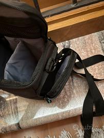 L’interno è diviso in due scompartimenti, ed è presente una tasca con cerniera + due tasche esterne laterali