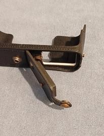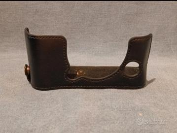 Custodia Fujifilm XT30 (mark I) in pelle, scomponibile, venduta insieme a un laccio in pelle della stessa marca.