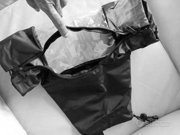 Questa copertura impermeabile è in nylon nero molto resistente, ha una pratica finestrella in plastica trasparente, doppia chiusura a cerniera e protezioni regolabili.