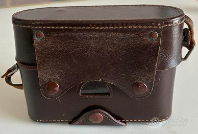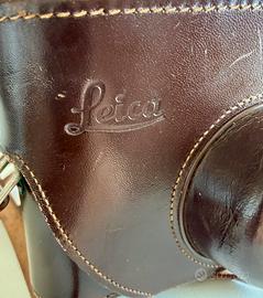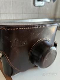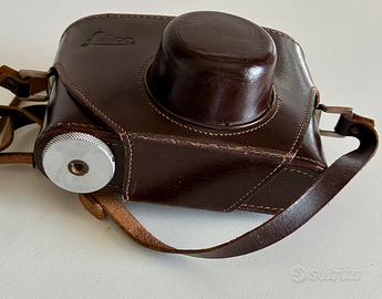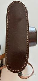 Custodia "Ever-Ready" vintage in pelle marrone per fotocamere a telemetro Leica, specificamente progettata per i modelli degli anni '50 come la Leica IIIg. Questa tipologia di custodia, prodotta da Leitz a Wetzlar, è caratterizzata da una struttura rigida che permette di utilizzare la fotocamera senza doverla estrarre completamente, grazie alla parte anteriore ribaltabile. Progettata per corpi macchina Leica con innesto a vite (Screwmount), in particolare la IIIg e la 1g, che sono leggermente più grandi rispetto ai modelli precedenti come la IIIc o la IIIf.Design "Hightop". Presenta una parte superiore più alta per ospitare accessori montati sulla slitta, come esposimetri o mirini esterni. Realizzata in pelle di alta qualità con interni spesso rivestiti in velluto per proteggere il corpo macchina. Include una vite di fissaggio (solitamente da 3/8" o 1/4") per assicurare la fotocamera alla base e una tracolla in pelle coordinata.