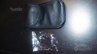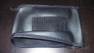 Vendesi custodia per fotocamera compatta, di colore nero, con laccio da polso e passante per cintura.