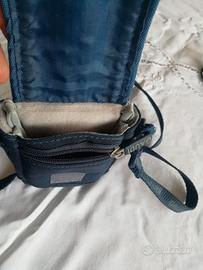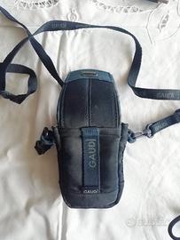 Custodia semirigida Gaudì, molto bella, elegante e comoda, permette di proteggere dalla polvere e di trasportare comodamente la fotocamera, con tracolla e asola per cinta pantalone. Munita di chiusura con velcro e di una piccola tasca con lampo, per custodire SD Card, batteria supplementare, etc. In ottime condizioni.