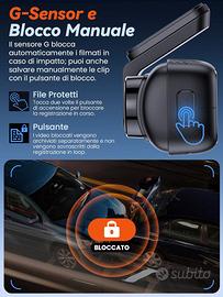🚕 Registrazione in Loop + Sensore G: La funzione di registrazione in loop sovrascrive i vecchi file quando la memoria è piena, garantendo una copertura continua. Il sensore G integrato blocca automaticamente i video in caso di collisioni improvvise, impedendo la cancellazione di prove importanti.