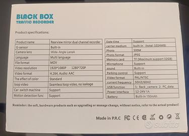 DASHCAM per auto 1296P Full HD. L'oggetto è nuovo di fabbrica con scatola originale, mai usata. Visione anteriore e posteriore, infrarossi per visione notturna in full HD. Registra tutti i movimenti sorvegliando la macchina da vandali e ladri sia di notte che di giorno anche quando è in movimento. Prezzo E 60,00 . Per info tel. 3381814483