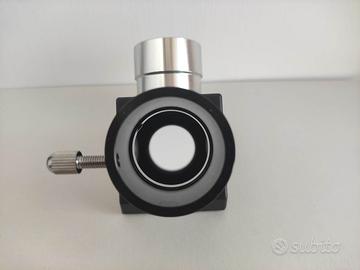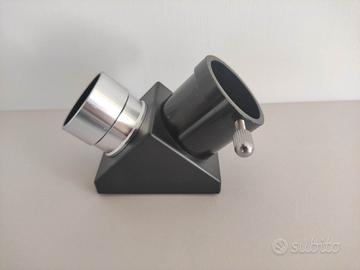 Diagonale a specchio 90° per telescopio, con innesto lato tubo ottico e portaoculari da 1.25", entrambi in alluminio. Corpo discretamente robusto, con scocca in plastica dura e fondo in metallo. Sistema di serraggio degli accessori con classica vite.