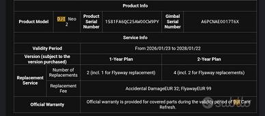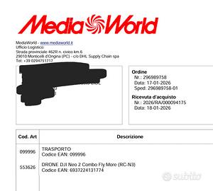Dji neo 2 acquistato il 18/01/2026 e con 2 cicli di ricarica combo fly more: - drone - Radiocomando - 3 batterie + dockstation - ricevitore Compresi nel prezzo: - Custodia rigida, - Borsetta dji - Protezione gomma radiocomando - Paraeliche startac (nero) - Protezione gimbal (verde) - Protezione ricecitore (verde) - Supporto telefono inclinato - Dji care 2 anni PREZZO NON TRATTABILE