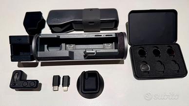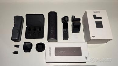 DJI OSMO POCKET 4K, in ottime condizioni, usato davvero poco. IMMAGINI SUPERSTABILIZZATE IN MOVIMENTO con Qualità DJI. App MIMO per rivedere e caricare subito sullo smartphone. Filtri TIFFEN Professionali magnetici ND 4, 8, 16 PL ( Polarizzatore )+ Lente MACRO. OSMO POCKET CHARGING CASE contenitore cilindrico con batteria che ricarica Osmo Pocket, lo contiene e protegge. Osmo Pocket Expansion Kit 2 dei 3 accessori: Rotella per Pan e Tilt manuale e Gabbia per fissare Osmo Pocket ovunque usando stessi attacchi gopro. NO terzo accessorio basetta tonda con attacco usbc. Base in gomma per tenere in verticale appoggiato su un piano Osmo Pocket. 2 Plug per fissare Osmo Pocket a Smart Phone, usando l'ampio schermo del telefono con l'app DJI Mimo; compatibile lightning e usb-c. È tascabile, si accende in 2 secondi, si spegne in 1 secondo, rapidissimo. In un attimo premendo un tasto passa da VIDEO a FOTO Jpeg e Raw. I filtri ND permettono immagini fluide perchè rallentano la velocità dello shutter, l'immagine diventa immediatamente Professionale. La Lente Macro offre fuoco molto ravvicinato con forte ingrandimento. Registra l'audio con due microfoni.