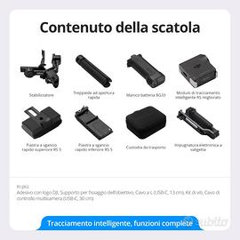 Include DJI RS 5, il modulo di tracciamento intelligente migliorato RS, l'impugnatura elettronica a valigetta, il treppiede ad apertura rapida, il manico batteria BG33 e altro ancora, per un'esperienza creativa completa di tutte le funzionalità.