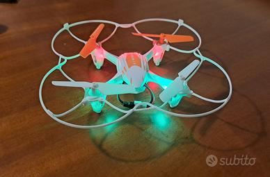 La confezione include un cavo di ricarica USB e eliche di ricambio.La diagonale del drone è di 18 cm.Trasmettitore con 6 pile AA incluse. Il drone ha batteria ricaricabile che non tiene più la carica, riesce a far girare le eliche ma non ha farlo alzare. Altri dettagli nell'ultima foto. Preferibile consegna a mano