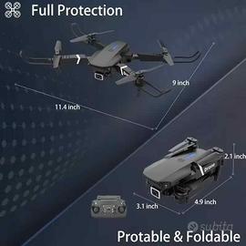 Il drone pieghevole E88 è dotato di doppia fotocamera HD, funzione di rotazione a 360°, motore brushless, posizionamento con flusso ottico, evitamento ostacoli di emergenza, decollo e atterraggio con un solo tasto, connettività Wi-Fi ed è facile da usare. Viene fornito con contenitore per il trasporto.