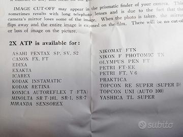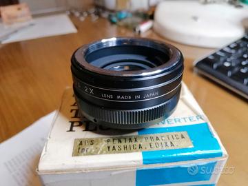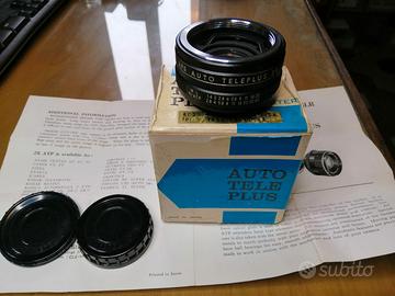 Duplicatore di focale Auto Tele Plus 2X made in Japan in perfetto stato di conservazione. Si può montare su molte reflex: Pentax, Praktica, Yashica, ... vedi foto per un elenco di compatibilità. Scatola in cartone originale (in cattivo stato), tappi anteriore e posteriore e foglio con istruzioni.