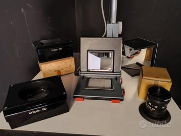 Vendo ingranditore Durst M700 revisionato, stampa formati 35mm 6x6, 6x7. Completamente pulito, lubrificato e testato: Pronto all'uso. Modello di fascia autoriale pro con possibilità di stampare da 35mm e 6x9 fino a 40x50 in verticale e senza limiti a parete con la testa ruotabile. Ha inoltre la robustissima colonna del tipo sdoppiato per agevolare la stampa a pavimento con notevoli ingrandimenti anche in verticale. Presente lo spazio per i filtri per stampare sia carta monogrado che multigrade. A corredo: --ottica Kowa (computar) vari-focal 50-80 F4.5 8 lenti, rara e dalla resa straordinaria; permette inoltre di variare la focale per stampare da 35mm a 6x7 senza sostituire l’obiettivo. Esemplare nuovo e perfetto fondo di magazzino con scatola. -porta negativi con vetri AUDA 70 NUOVI -1xcondensatore unicon 50, ottica perfeta e pulita -1xcondensatore unicon 85, ottica perfeta e pulita in scatola Disponibili a parte: -Kit condensatore + obiettivo e lapla per formato 6x8 6x9 -vetri anti newton -inserti senza vetro -La mpadina LED pari potenza e colore (15€) -Lampadine con diversa potenza per applicaizoni dedicate Altre ottiche Schneider componon, Rodenstock rodagon, EL-nikkor, Komura ecc.. Parte elettrica testata e perfettamente efficiente (lampadina 75W) Base 50x55cm. É possibile visionarlo e provarlo su appuntamento prima dell'acquisto. Scambio tra privati di materiale datato: esclusa ogni forma di garanzia. Pagamento con Paypal (+4%) bonifico o contanti alla consegna. Posso spedire al costo di 50€ ma consiglio ritiro a mano. Sconto 5% per studenti di scuole di fotografia, accademie e simili. guarda anche le mie altre vendite per materiale da camera oscura