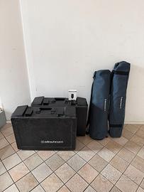 Elinchrom Style rx 600 Swiss Studio Flash Quantità: 4 Flash in 2 valige 1 x Elinchrom Softbox 100x100 cm 2 x Elinchrom Softbox 65x65 cm Completi di telo diffusore, smontabile e con sacche di trasporto Cavalletti compresi