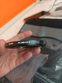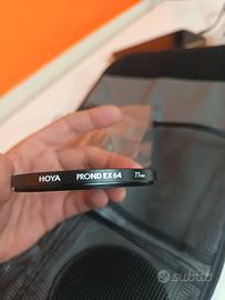 Astuccio con 4 filtri Fotografici HOYA ProndEx 1000 77mm/82mm ProndEx 64 77mm ProndEx 8 77mm HOYA PROND EX è un classico filtro grigio che può essere utilizzato in modo creativo non solo in ambito fotografico, ma anche in quello di videoregistrazioni. Fornisce un'ulteriore modalità di controllo sull'esposizione, in quanto la riduce di 10 gradi dell'apertura e, grazie alla correzione di altri parametri dell'immagine, consente di ottenere degli effetti davvero unici. I filtri grigi ND principalmente vengono utilizzati per il prolungamento del tempo di esposizione che crea un effetto di movimento sfocato, visibile particolarmente nella fotografia paesaggistica. Inoltre, consentono una maggiore apertura del diaframma dell'obiettivo, durante le riprese video o gli scatti, consentendo di ottenere un'ottimale profondità di campo, anche in presenza di una forte luce ambientale.