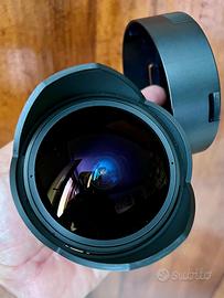 Come tutte le ottiche fisheye ha un tappo copri-obiettivo un po’ particolare che, vista la forte curvatura della lente frontale, va a innestarsi sul paraluce a petalo incorporato.