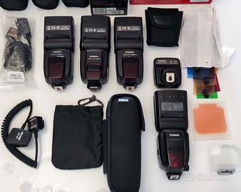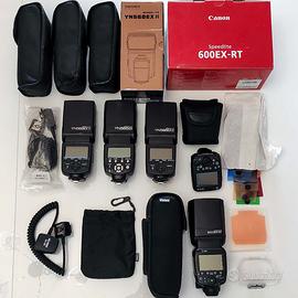 1 flash canon speedlite 600 ex-rt con scatola + 1 yongnuo yn-e3-rt transmitter + 2 yongnuo 568 ex II + 1 yongnuo 565 ex + 2 cavi ttl + gelatine, custodie, diffusori, basi flash, trigger. Kit studio portatile, usato non più di una decina di volte.