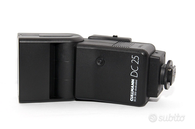IL CULLMANN DC 25 , E’ UN FLASH POTENTE E COMPLETO. E' DOTATO DI PIEDINO SCA INTERCAMBIABILE. PUO' FUNZIONARE IN MODALITA' MANUALE O AUTOMATICA, CON LA QUALE DOSA AUTOMATICAMENTE LA DURATA E L’INTENSITA’ DEL LAMPO AL FINE DI GARANTIRE LA CORRETTA ILLUMINAZIONE. IL NUMERO GUIDA E’ 25 (100 ISO). HA LA PARABOLA ORIENTABILE VERSO L'ALTO. ALIMENTATO DA 4 BATTERIE STILO DA 1,5V.