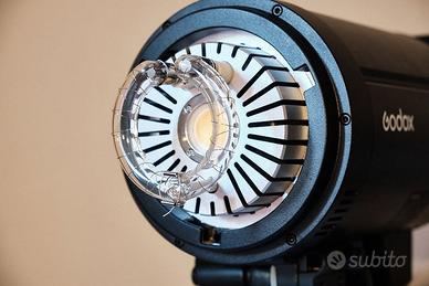 Flash da studio professionale monoluce Godox DP400III-V. Dotato di luce di modellazione a 30W, montatura Bowens per i modificatori di luce e il coprilampada, sistema wireless 2.4G, luce principale a a 400W di potenza e 5600K di temperatura.