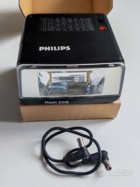 Flash elettronico Philips 20B , anni 70-80, dotato di attacco a baionetta con funzione automatica o tramite cavetto incluso. Funziona con due batterie AA non incluse. Manuale di istruzioni. Confezione originale.