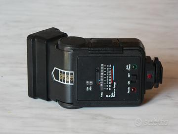 Lampeggiatore elettronico automatico Hanimex 325AZ. NG 25 a 100 ISO, funzionamento manuale o automatico, scala diaframmi da 1.4 a 22, sensibilità ISO regolabile da 25 a 1000 (DIN 15-31). Parabola orientabile verticalmente da 0° a 90° a passi di 15°. Fornito con confezione originale, manualetto di istruzioni (non in italiano), tre filtri colorati (rosso/verde/blu) e diffusore grandangolare.