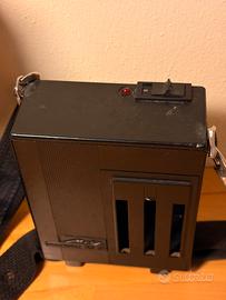 Flash fotografico Metz Mecablitz di produzione vintage, completo di unità flash principale con parabola orientabile e batteria esterna dedicata con tracolla. Il sistema è progettato per fotografia analogica e utilizzo professionale dell’epoca. Il flash è dotato di scala di esposizione sul retro, cavo di collegamento originale e supporto laterale. La batteria esterna Metz è completa di cintura/tracolla e connettori originali. Presente interruttore con spia di funzionamento. Condizioni usate, coerenti con l’età: normali segni superficiali su scocca e accessori. I cavi risultano integri. Il funzionamento non è testato con pellicola o fotocamera, pertanto l’oggetto è da considerarsi non verificato operativamente. Ideale per collezionisti di fotografia vintage, appassionati di attrezzatura Metz o come elemento scenografico e da esposizione.