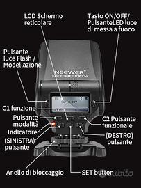 Supporta manualmente TTL, Slave ottiche (S1, S2), modalità stroboscopica, sincronizzazione tende anteriori/posteriori, protezione da surriscaldamento, modalità sleep automatica. 5 s; guida alta n. 32 (ISO 100, 105 mm)
