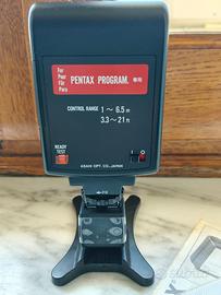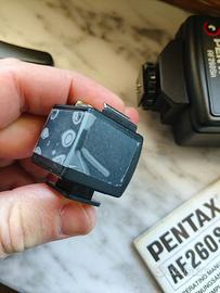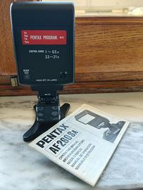Flash perfettamente funzionante, completo di diffusore (si vede nella prima foto, è applicato al flash) e istruzioni. Sulle Pentax dotate di funzionalità "Program" (quindi anche su tutte le digitali Pentax) funziona con modalità a diaframmi atuomatici: il flash legge gli ISO impostati nella fotocamera e imposta il diaframma più appropriato. Completano l'annuncio: - una servocellula per pilotare il flash come slave usando un altro flash come master; Ho messo il nastro perché si è scollato un tappo posteriore, ma è funzionante; - lo stand che vedete in foto. Segnalo ossidazione sullo sportellino del flash, ma i contatti interni sono perfettamente integri e lucidi. Nota: per usarlo come slave pilotato dal flash pop-up delle fotocamere Pentax è necessario poter disabilitare il TTL, cosa che almeno sui modelli meno recenti di digitali Pentax avviene solo se si usano ottiche manuali. Diversamente la servocellula farà scattare il flash all'emissione dei lampi di misurazione TTL e non durante l'apertura dell'otturatore.