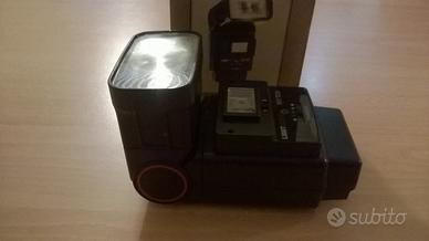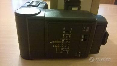 Doppio flash a lampo. Tirata illuminazione reale mt 14, ma effettiva ( a seconda dell'oscurità) metri 5/6. Alimentazione a 4 batterie stilo classiche. Ricarica veloce dopo 05/8 secondi. Regolazione dei DIN e focale. Direzionabile alto, basso, rotatorio. Ottimo e conservato. Perfettamente funzionante. Dotato di istruzioni e scatola originale.