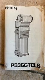 Flash Philips modello P536GTCLS con testa luce orientabile e girevole con paraluce, staffa di aggancio alla fotocamera, 3 filtri colore e manuale.