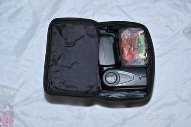 Completo di scatola, manuale, custodia morbida, diffusore bianco, filtri arancione e verde, piedino.