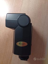 Flash Yashica CS-220 Auto è indicato per tutte le fotocamere 35mm. Con testa orientabile (in verticale), Numero Guida: 22 (100 ISO) e alimentazione: 4 batterie AA da 1,5 volts