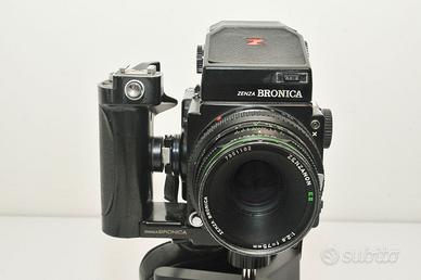 Macchina fotografica analogica di medio formato 4,5x6 ZENZA BRONICA serie ETRS con impugatura scatto mirino pentaprisma AE-II obiettivo ZENZANON MC f =250mm. dorso pellicola 220.