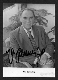 Fotografia del dopo guerra e autografata originale di Max Schmeling, campione tedesco di pugilato. - Ritratto del pugile su foto cartolina con firma originale . - Misura cartolina : 15 cm x 10,5 cm Nel corso della seconda guerra mondiale Schmeling fu arruolato come paracadutista nella Luftwaffe ed il 20 maggio 1941 fu paracadutato su Creta con il suo reparto nella battaglia per la conquista dell'isola. Nel dopoguerra ha combattuto ancora quattro volte, con due vittorie e due sconfitte. Si è ritirato nel 1949. Max Schmeling è morto a 99 anni, nel 2005. La International Boxing Hall of Fame lo ha riconosciuto fra i più grandi pugili