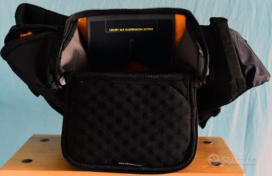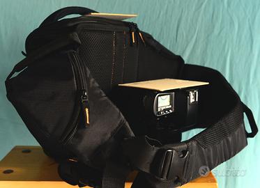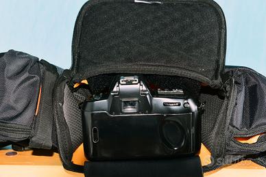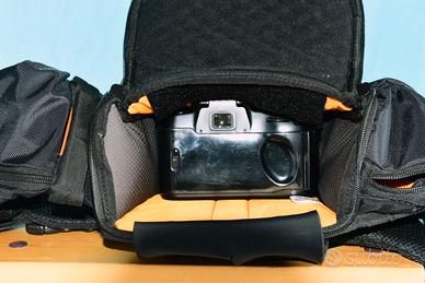 Borsa zoom, allaccio a vita. Può contenere una fotocamera motorizzata con zoom montato(la profondità è di 22/23 cm.Una tasca laterale può contenere un obiettivo, ed un altra un flash. Mai usata. La fotocamera NON è compresa nella vendita. La borsa cedo per 20€. NON spedisco.