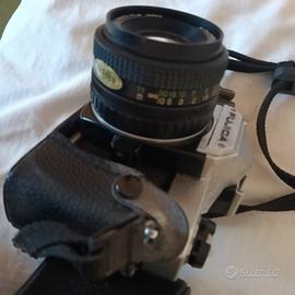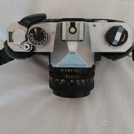 completamente meccanica equipaggiata con obbiettivo x-fujinon 55 mm f/2.2 corpo robusto in metallo con pulsante per la profondità di campo e autoscatto leggeri segni di usura