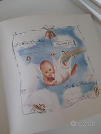 Vendo album fotografico in ecopelle vellutino di colore azzurro decorato con una lastra di argento bilaminato smaltato a mano con immagine di Nemo (Disney). Le dimensioni dell'album sono 32x32x3. Al suo interno ci sono 30 pagine in cartoncino di formato 30x30 separate da veline bianche. Le prime 6 con disegni e spazi per annotare (La favola preferita, Come cresco, Le mie vaccinazioni, I miei giocattoli, Il primo disegno, I miei amici, Le mie fotografie). Nuovo, mai usato, in perfette condizioni.