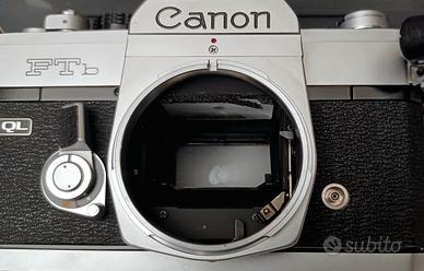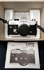 Canon FTb, solo corpo, in perfette condizioni estetiche e ottime condizioni funzionali (necessita minima lubrificazione otturatore). Viene fornita completa di tappo frontale, cinturino originale, un libretto d'uso in inglese (originale) ed uno in italiano, scatola/confezione originale.