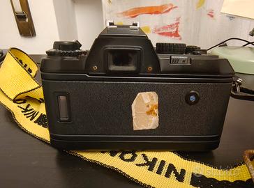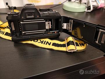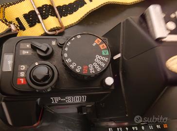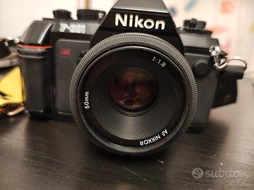 fotocamera analogica vintage Nikon f-301 con obiettivo da 50 mm, un pezzo di storia per gli amanti delle foto su pellicola, perfettamente funzionante.
