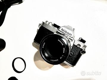 NIKON FM + NIKON 50 MM F/1.4 AI + MOTORE NIKON MD-12 + CUSTODIA IN PELLE NIKON.