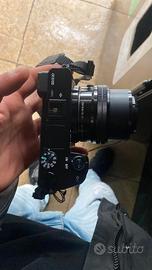 una fotocamera mirrorless Sony Alpha 6100 (indicata dalla scritta $\alpha$6100 sul corpo macchina) equipaggiata con un obiettivo zoom standard Sony E 16-50mm f/3.5-5.6 OSS. e un teleobiettivo Sony E 55-210mm f/4.5-6.3 OSS (modello SEL55210)