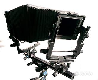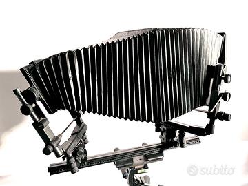 in vendita fotocamera grande formato 8x10"/20x25cm, in buono stato, movimenti micrometrici, soffietto a tenuta, perfettamente funzionante. Ha due difetti, vetro smerigliato leggermente scheggiato (vedi foto), movimento di decentramento laterale posteriore con barra dentata a cui mancano tre denti, per cui in quel punto si spinge a mano. Ideale per chi ha la passione per il grande formato e vuole spingersi al massimo, vendo al prezzo più basso della rete. Regalo alcune piastre porta ottiche. Inutile tentare di abbassare il prezzo.