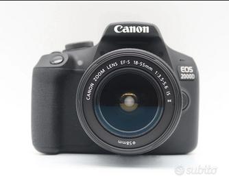 Vendo fotocamera Canon nuova. La vendita comprende. 1/ Canono 2000D 2/Canon zoom 18-55mm f/3.5-5.6 IS Il. 3/Canon E10E battery charger (never used). 4/Batteria 1 / Canon LP-E10 battery. 5/Batteria 2 / Canon LP-E10 battery (never used). 6/Tracolla / Canon shoulder strap. 7) Borsa da trasporto / camera bag by Reporter.